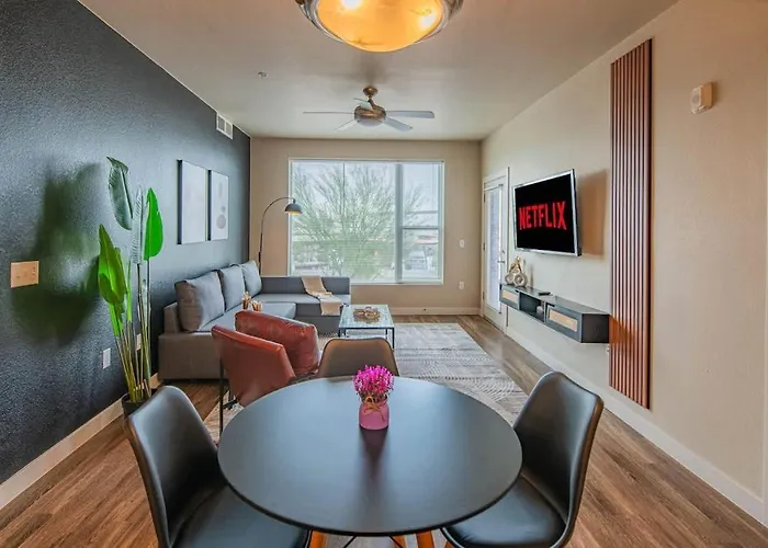 Tijdens een verblijf in Trendy 2Bd Gym Pool Parking Wd Sleeps 8 Appartement Tempe van 104 m² kunnen gasten zich ontspannen op een patio op circa 7 km van de Dierentuin van Phoenix. Wi-Fi is beschikbaar voor zakelijke of recreatieve behoeften van gasten.